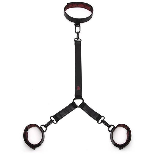 L'ensemble se compose d'un collier réglable et de menottes assorties, reliés par une chaîne métallique robuste. Le design réversible unique offre deux aspects séduisants : un noir élégant d'un côté et un rouge sensuel avec un motif de rose de l'autre. Cela vous permet d'adapter parfaitement l'ambiance à votre humeur.