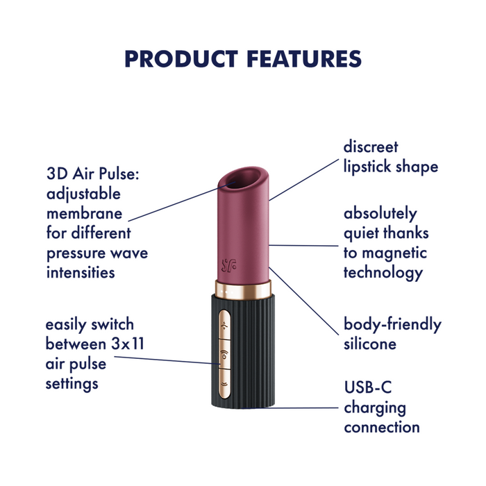 Imaginez : un rouge à lèvres élégant dans votre sac, qui promet bien plus qu'une touche de couleur. Le Satisfyer Pro 2 Kiss est conçu pour les femmes qui recherchent à la fois discrétion et plaisir intense – un secret parfait que vous pouvez emporter partout avec vous.